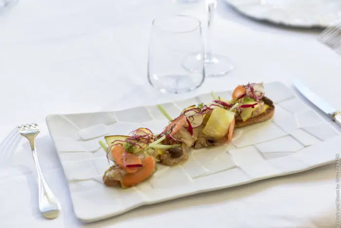 Au niveau du repas, nous décidons d’opter pour le menu « Mémoire du goût, les pins perchés » car le menu propose des mets que nous apprécions particulièrement. Comment résister à un menu qui vous propose des truffes, des Saint Jacques, des huîtres ? Le repas est aussi bon que le décor est beau, c’est tout simplement un régal.